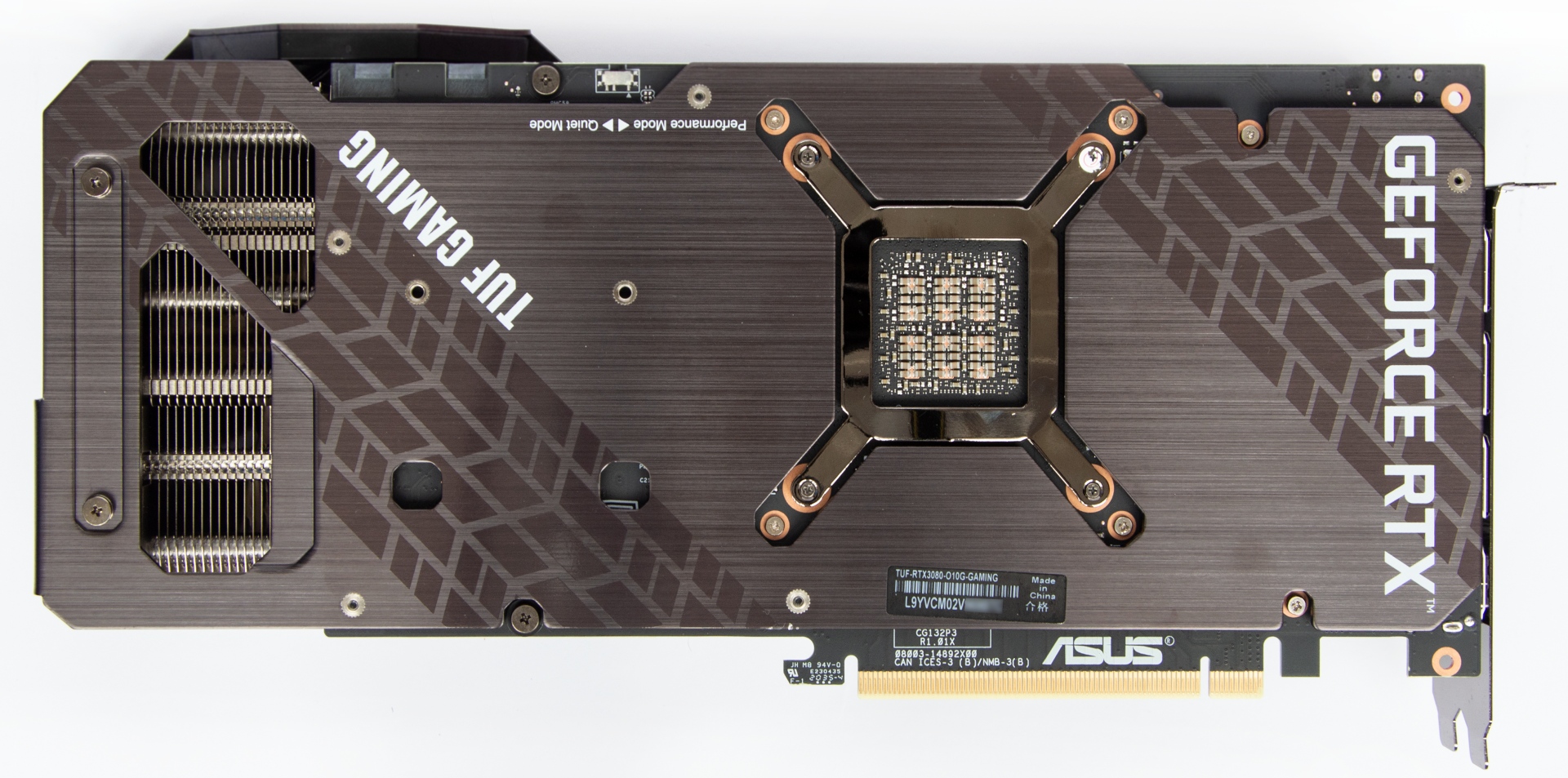 ASUS TUF-RTX3080-O10G-GAMING работает при повышенном Boost Clock 1785 МГц (стандартное значение 1710 МГц) с базовым значением 1440 МГц. Эффективная частота памяти 19000 МГц. Мощность повышена с 320 до 340 Вт.
