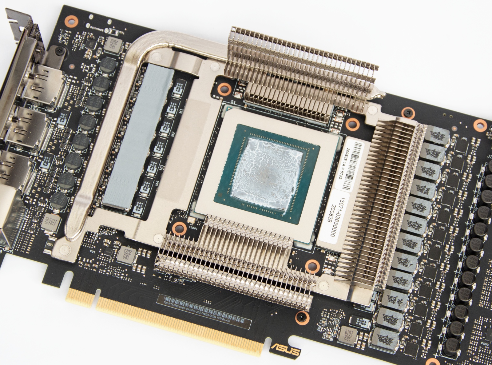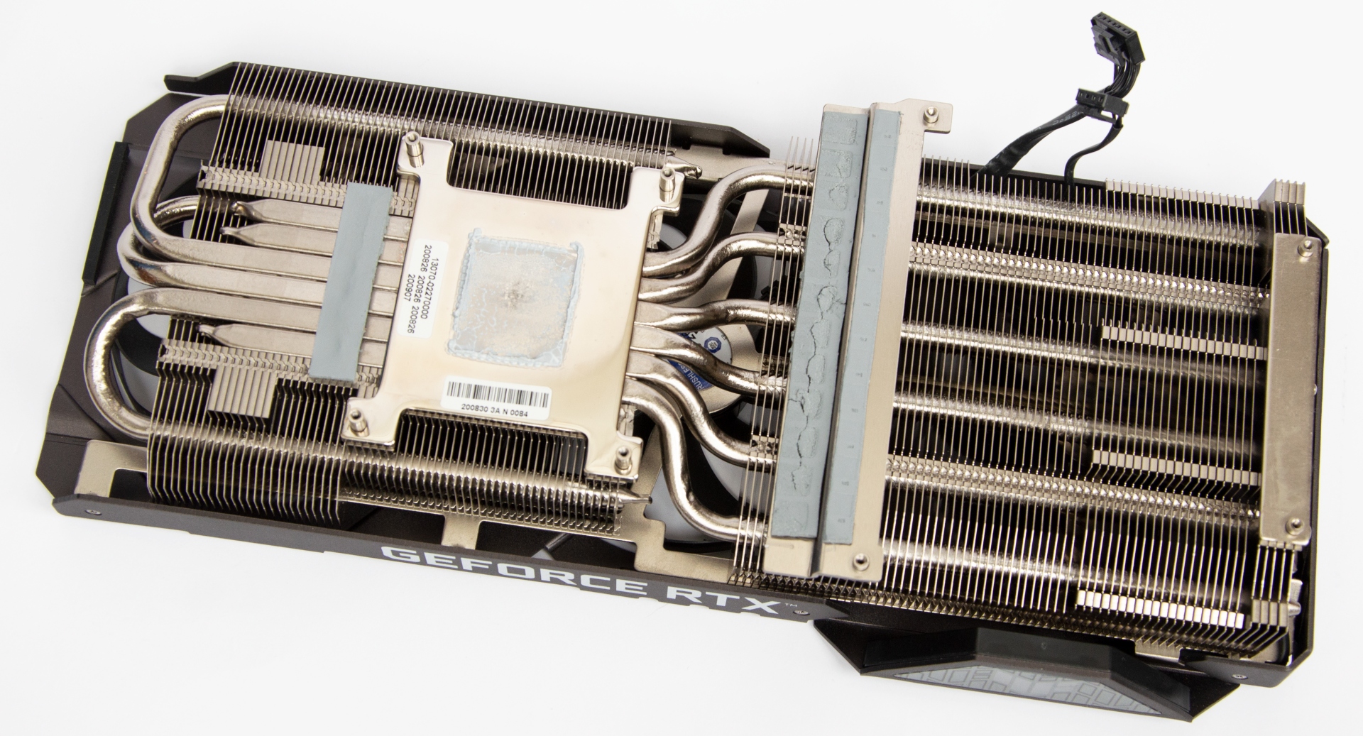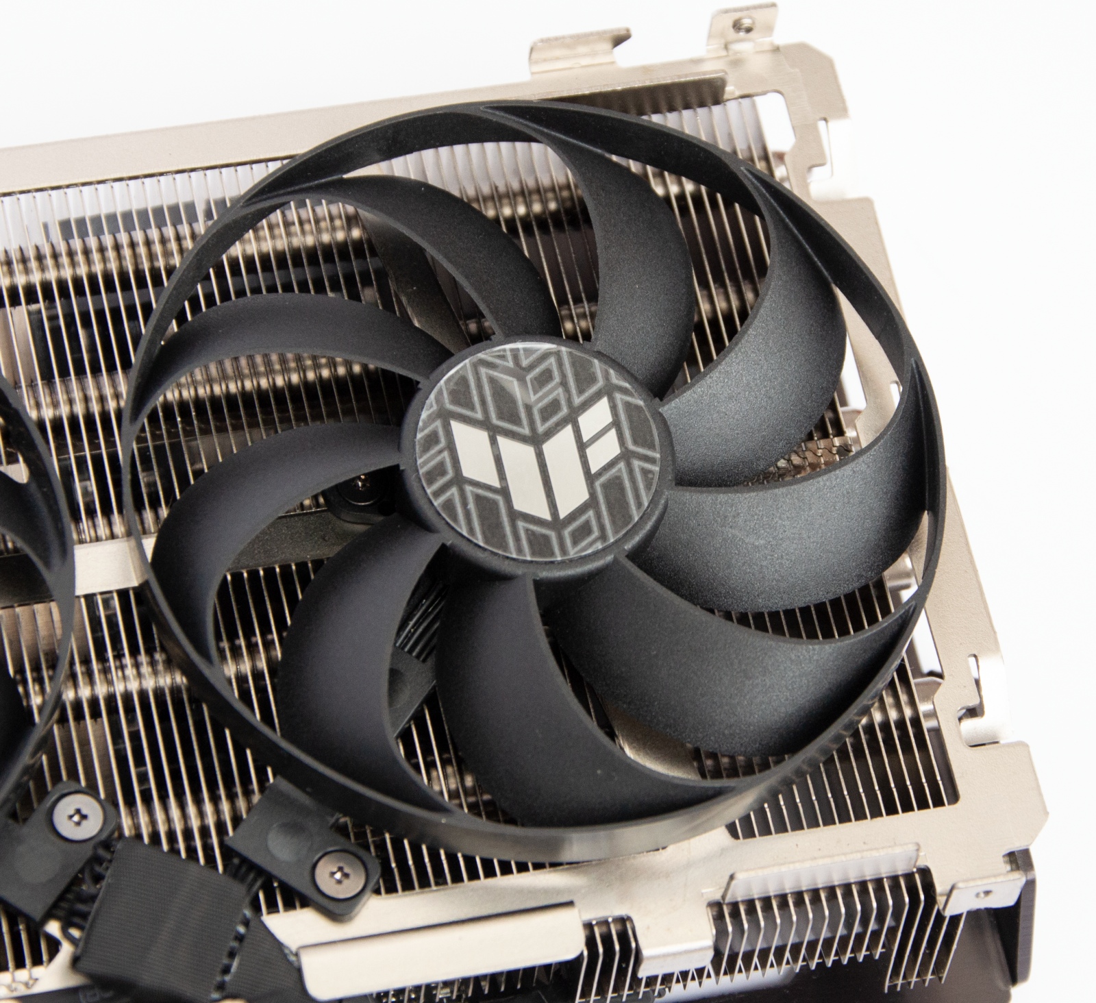 Конструкция охлаждающей системы идентична той, что используется в старой модели ASUS TUF RTX 3090. Основной радиатор состоит из двух секций пластин и шести тепловых трубок. Он отводит тепло от графического процессора и половины элементов питающей цепи.
