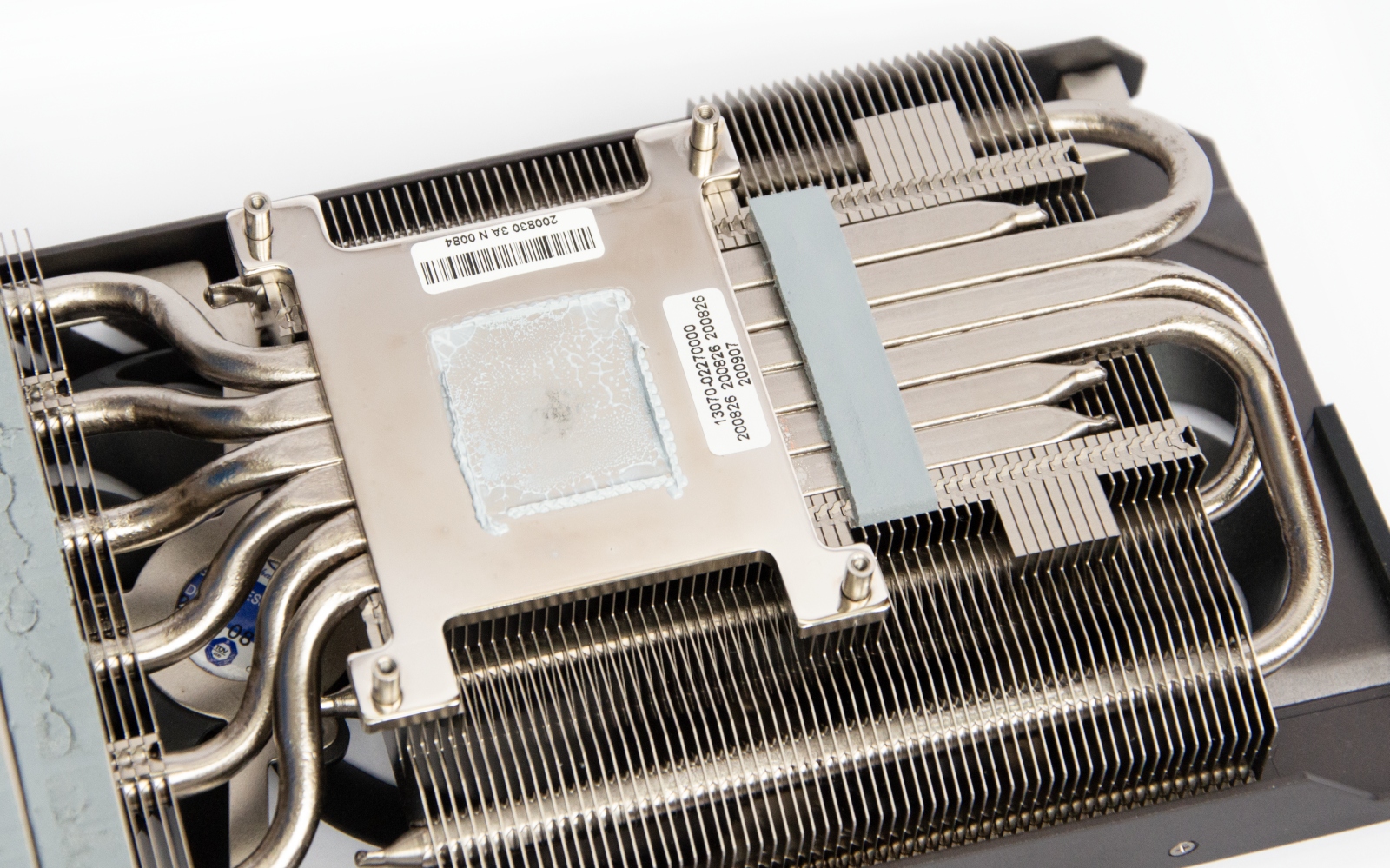 Микросхемы памяти и оставшиеся силовые элементы накрывает отдельный радиатор с тепловой трубкой и тремя блоками пластин. Он не имеет прямого контакта с большим радиатором, но частично соприкасается с ним через термопрокладки. Сами термопрокладки имеют вязкую структуру и легко рвутся при усилии, разбирать видеокарту без веской причины мы не рекомендуем.
