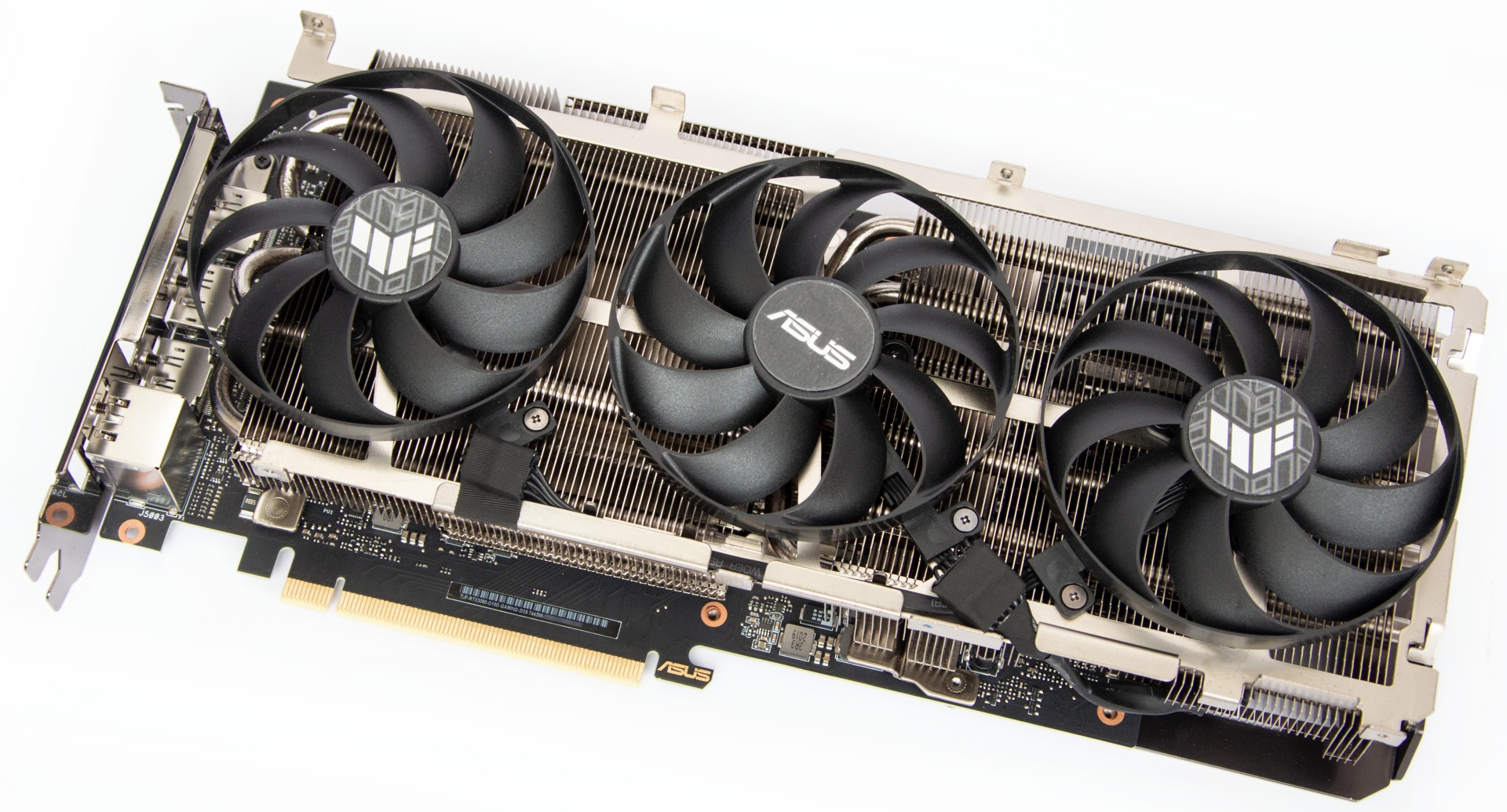 Внешне данная модель идентична другим ASUS TUF Gaming. Такие же строгие очертания металлического кожуха и мощный кулер с тремя вентиляторами.