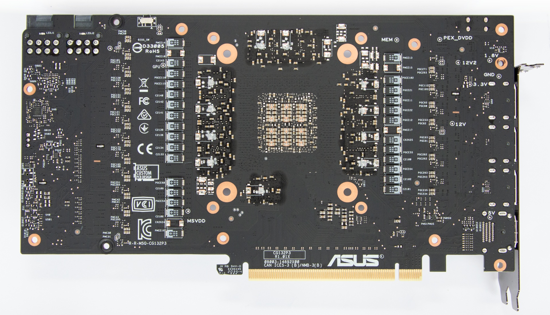 Сбоку в пластине есть прорези, чтобы уменьшить сопротивление воздушному потоку и лучше организовать охлаждение внутри корпуса. В углу присутствуют два восьмиконтактных разъема питания. Рядом с ними расположен переключатель BIOS. Предусмотрено две прошивки с разными настройками вентиляторов. По умолчанию работает Performance Mode с более высокими оборотами для лучшего охлаждения. Quiet Mode снижает обороты для тихого рабочего режима.