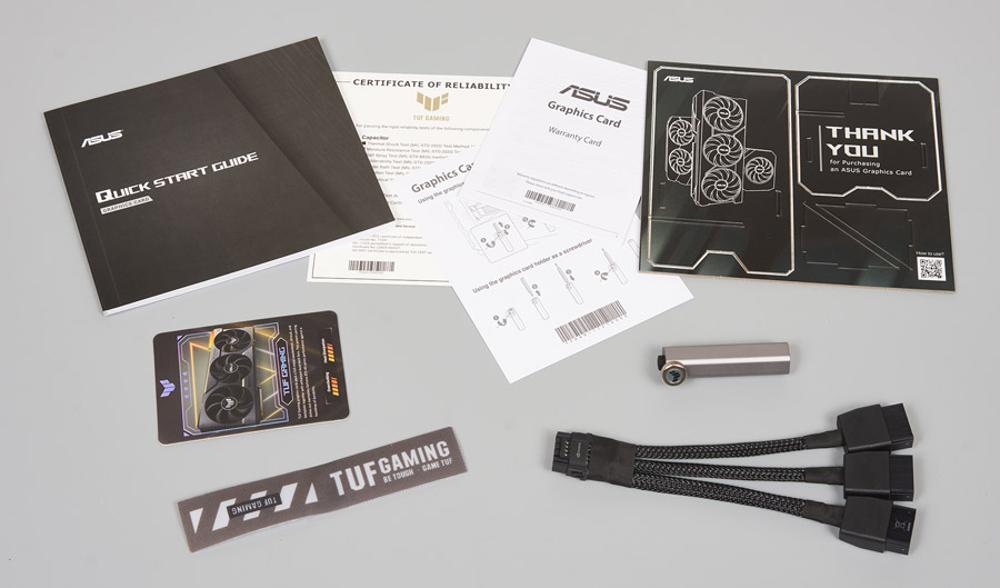 Помимо карты, пользователь в комплекте поставки найдет документацию, сертификат TUF, какой-то пазл, игровую карточку, подставку-отвертку и переходник питания.