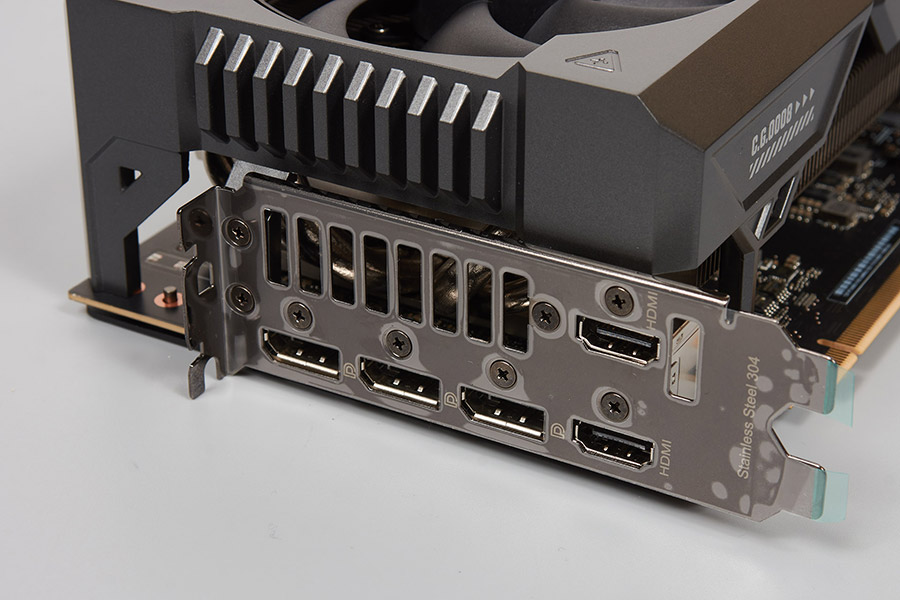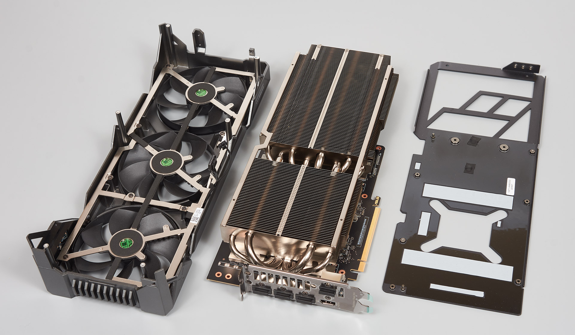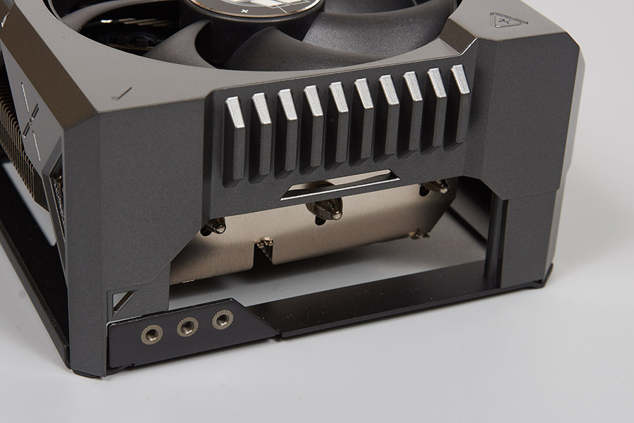 Достигается это благодаря литому толстому кожуху из алюминия, только штампованная задняя панель портит весь общий вид и кажется, будто она не с этой карты.