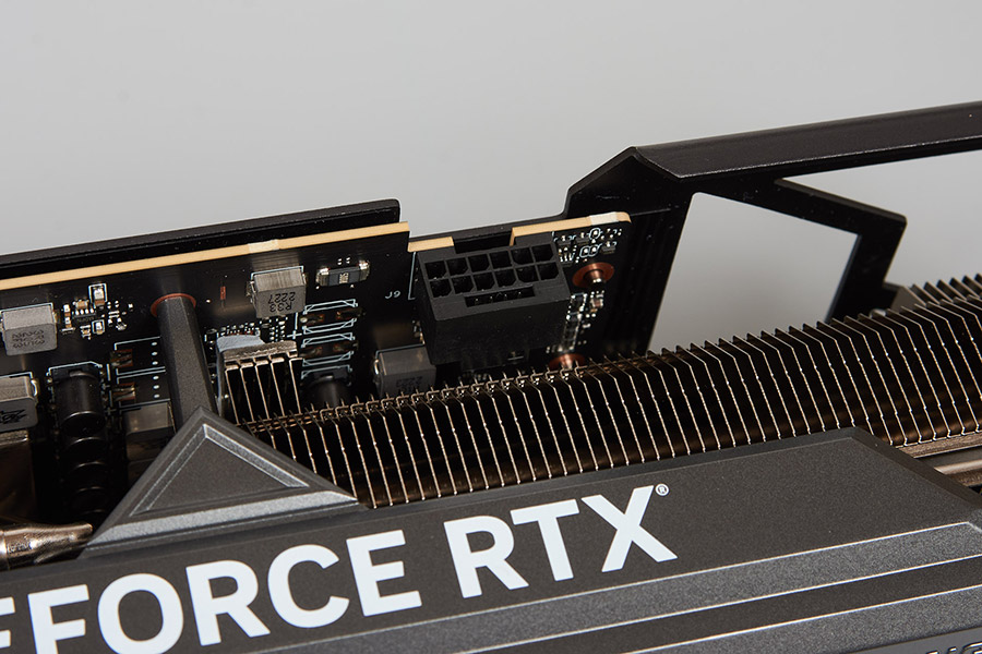 Разъем 12VHPWR находится почти по центру видеокарты, на краю печатной платы, которая занимает площадь чуть более половины устройства.