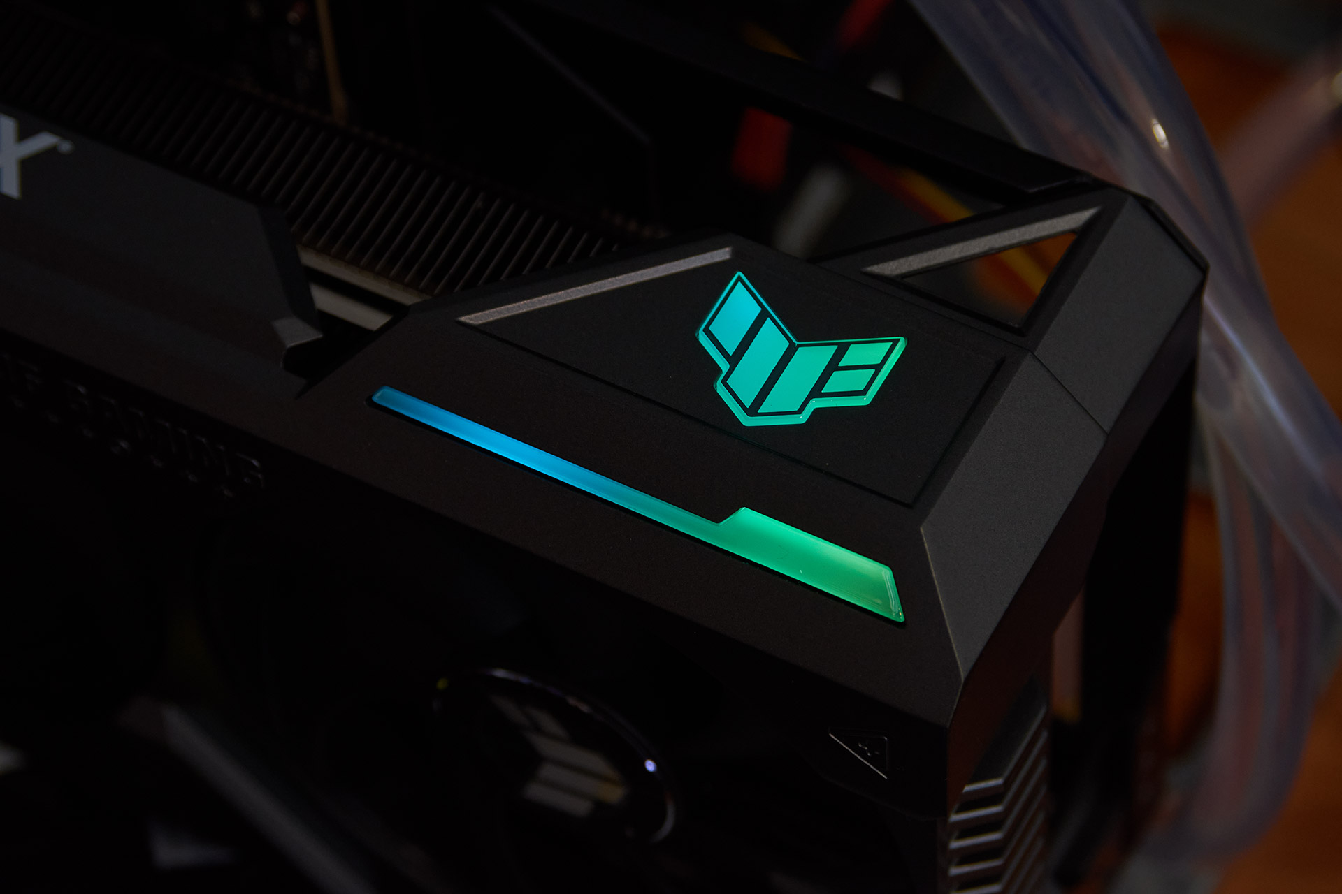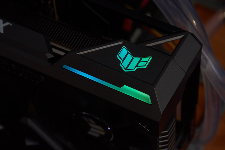 Как и у старшей модели, сверху на задней части кожуха находится полупрозрачный логотип TUF с полосой и RGB-подсветкой.