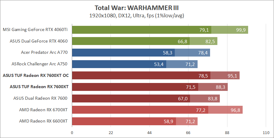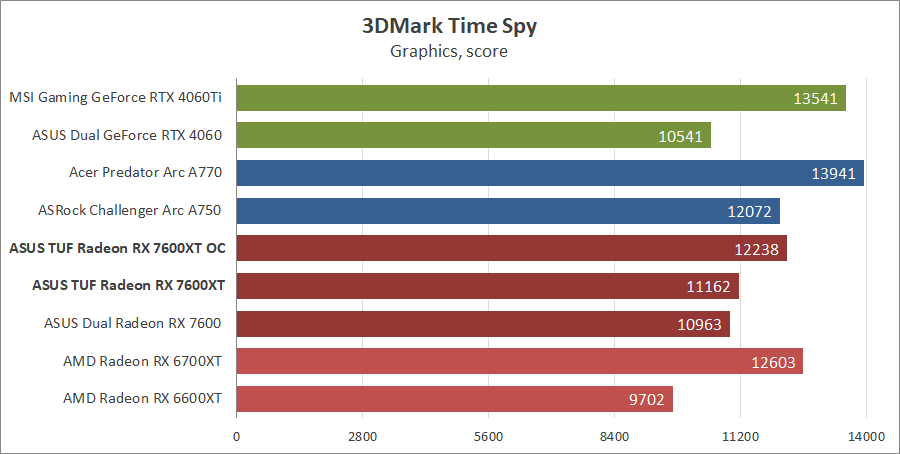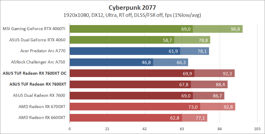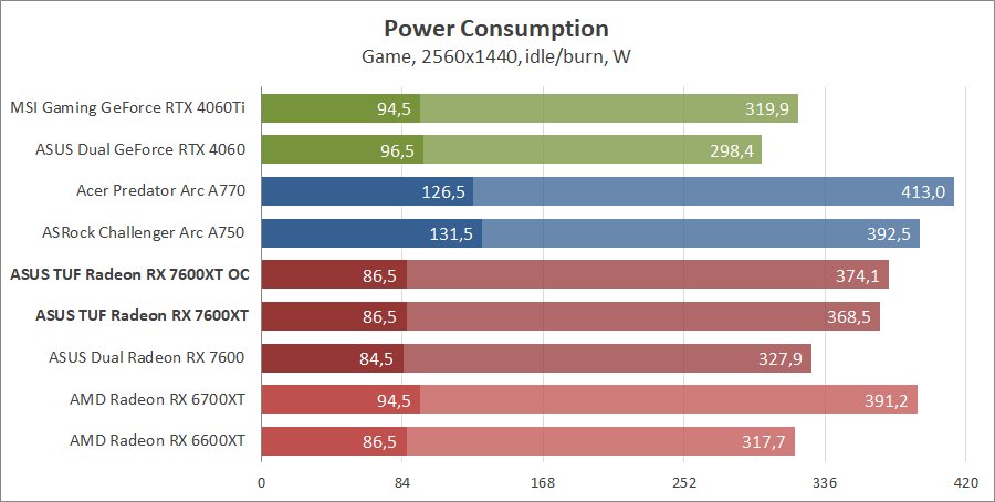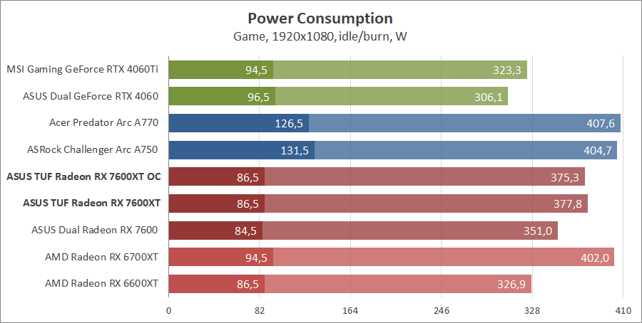 | Видеоадаптер | ASUS TUF-RX7600XT-O16G-GAMING | ASUS DUAL-RX7600-O8G | AMD Radeon RX 6700 XT | Gigabyte Radeon RX 6600 XT GAMING OC PRO 8G | MSI GeForce RTX 4060 Ti Gaming X Trio 8G | MSI GeForce RTX 4060 Ventus 2X Black 8G OC | Acer A770 16GB | ASRock Arc A750 Challenger D 8GB OC |