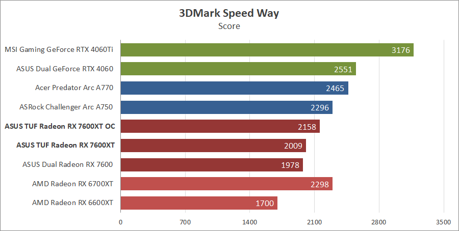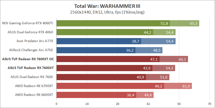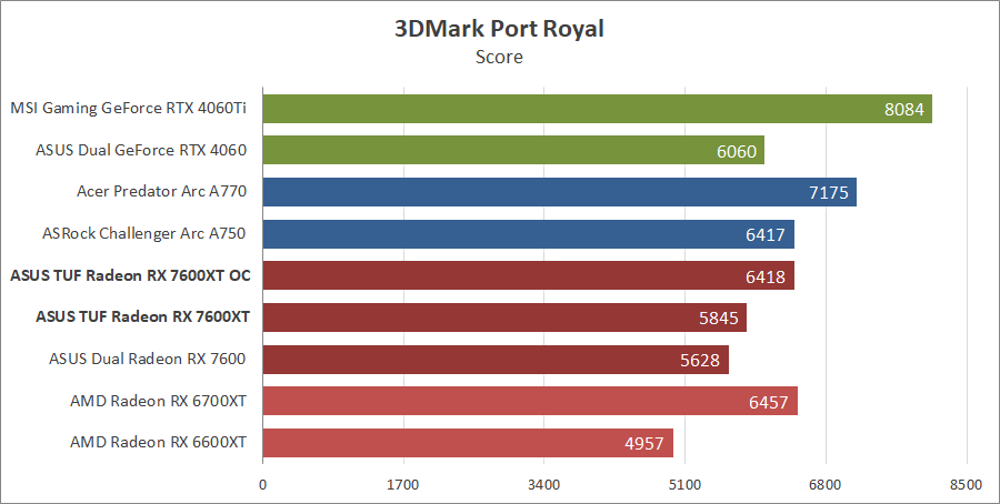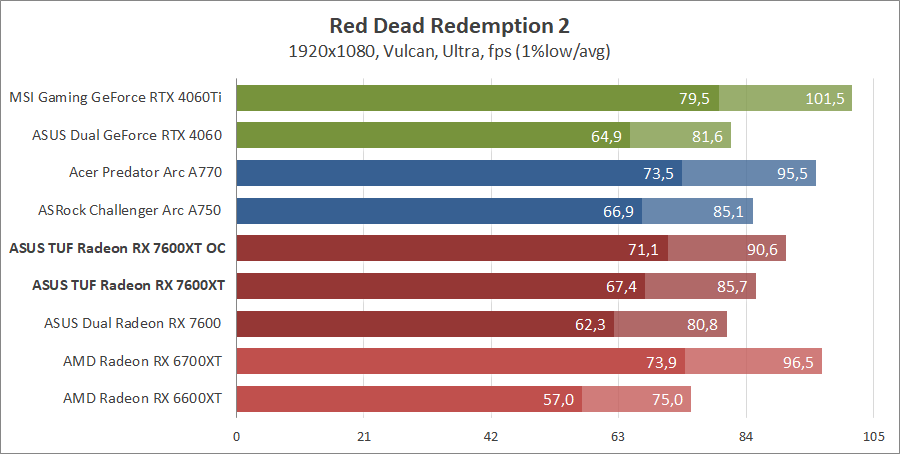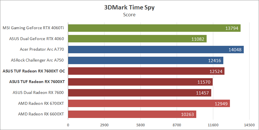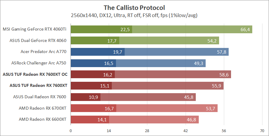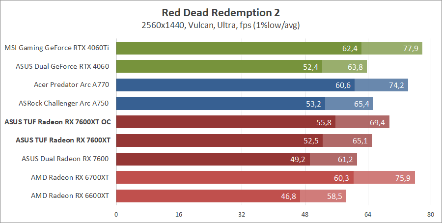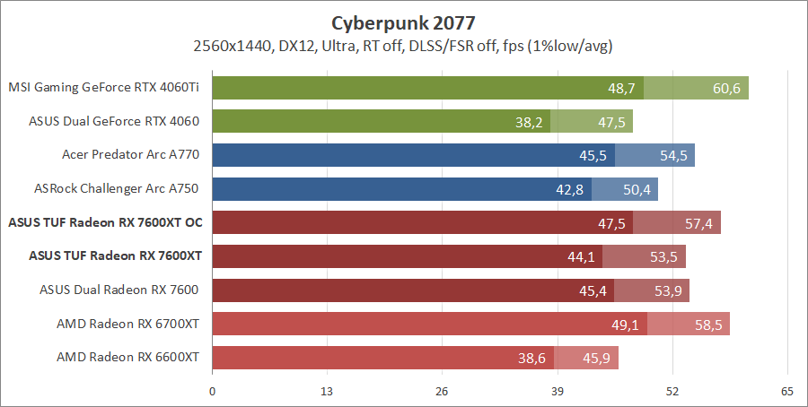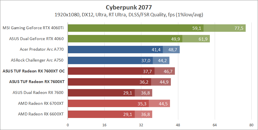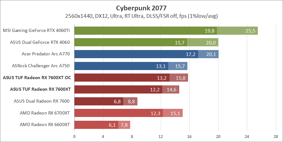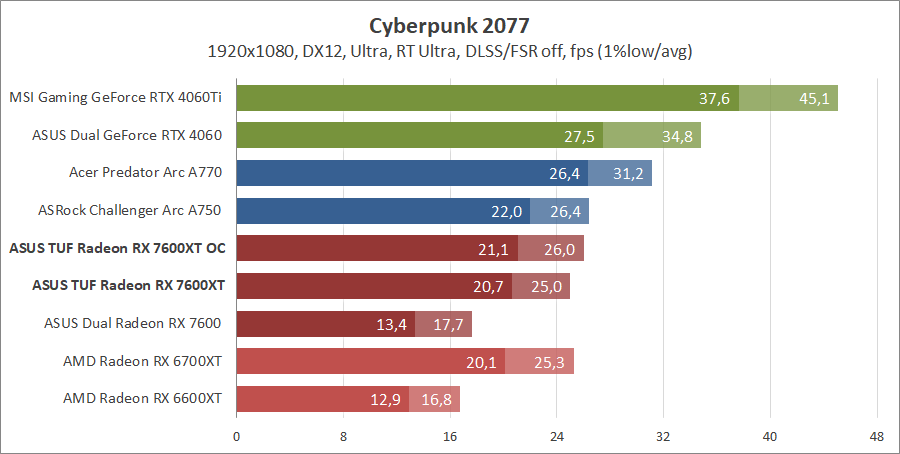 Для сравнения возьмем карты из прошлых тестирований, а именно ASUS DUAL-RX7600-O8G, MSI GeForce 4060 Ventus 2X Black 8G OC, GeForce RTX 4060 Ti Gaming X Trio 8G, AMD Radeon RX 6700 XT и Gigabyte GV-R66XTGAMINGOC PRO-8GD с ASRock Arc A750 Challenger D 8GB OC, а также добавим Acer Predator Arc A770 16GB.
