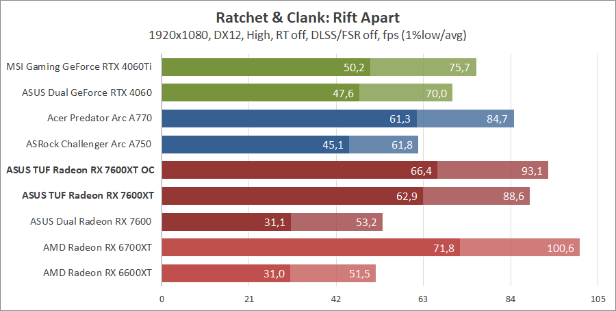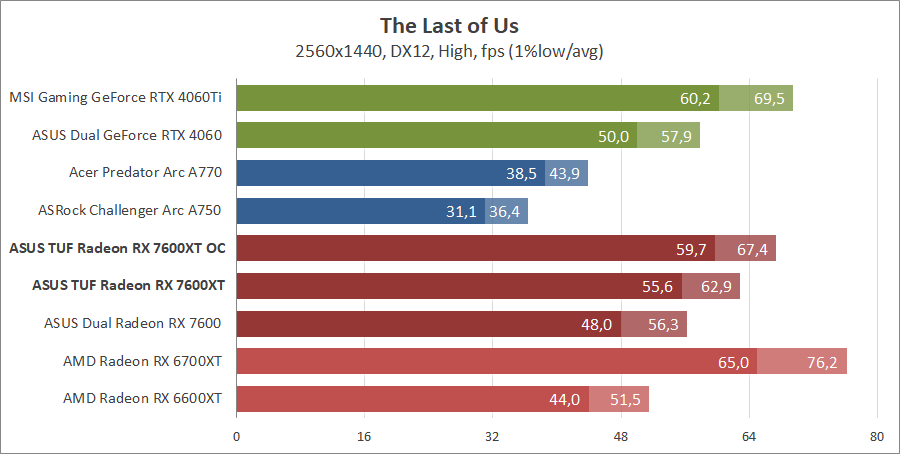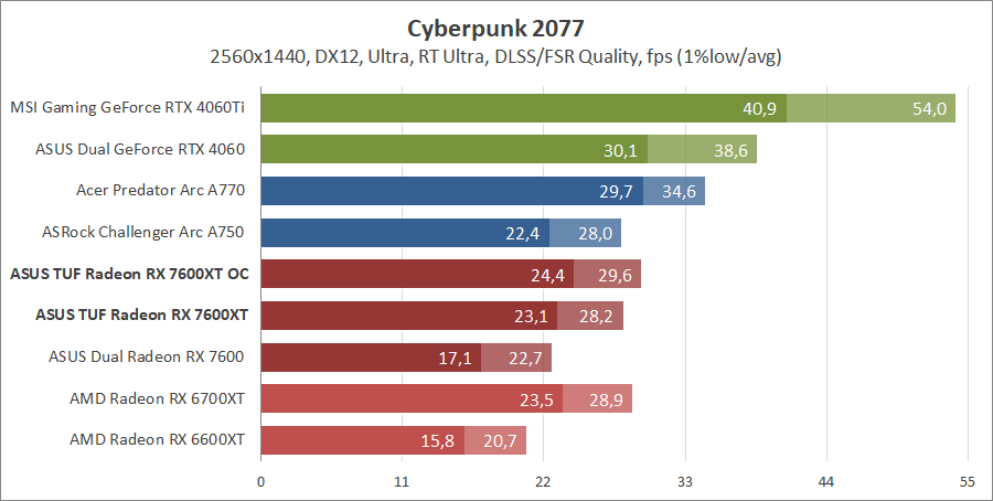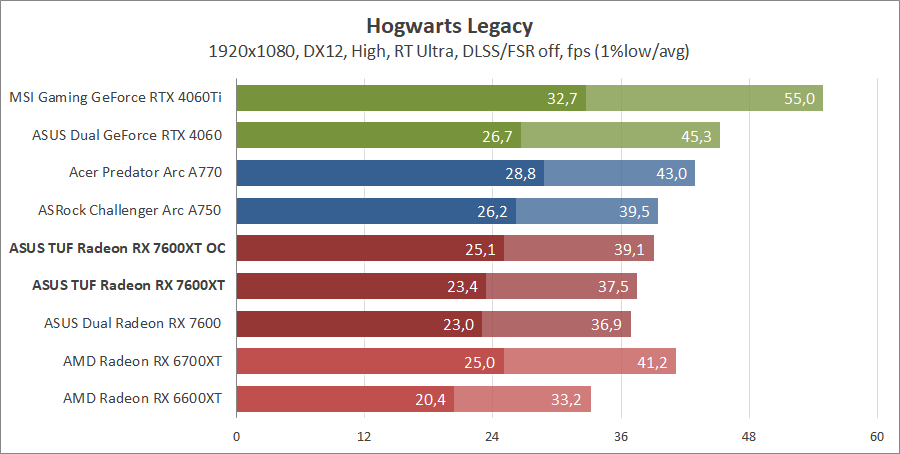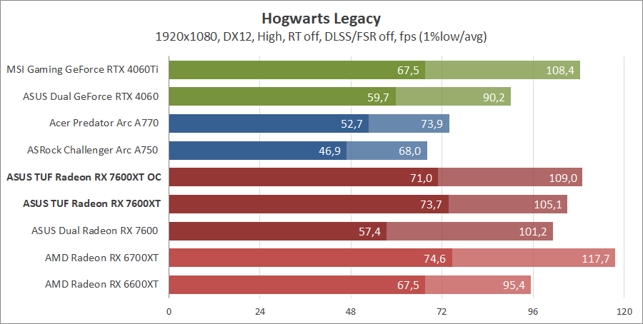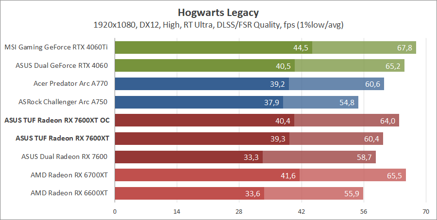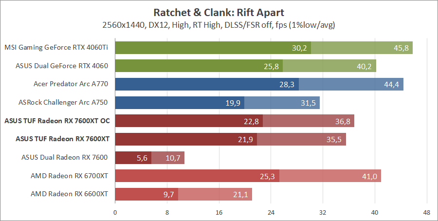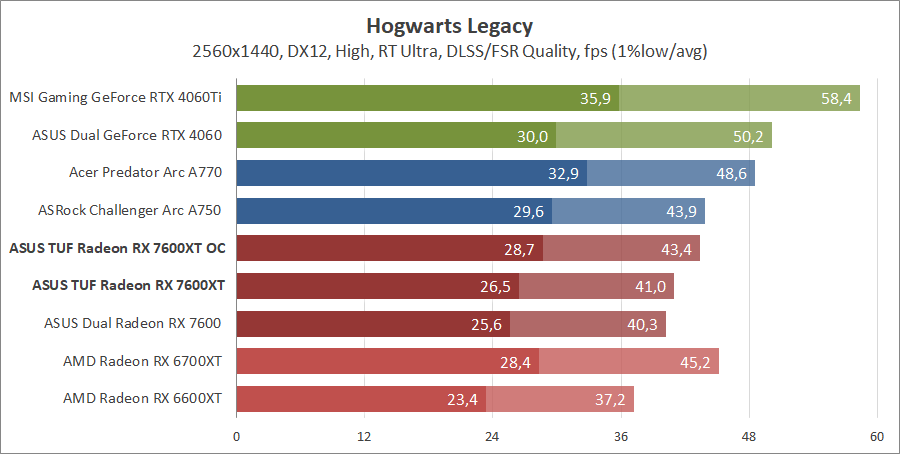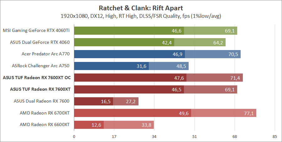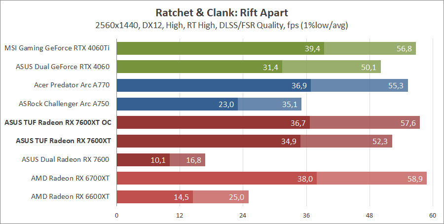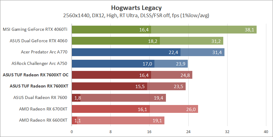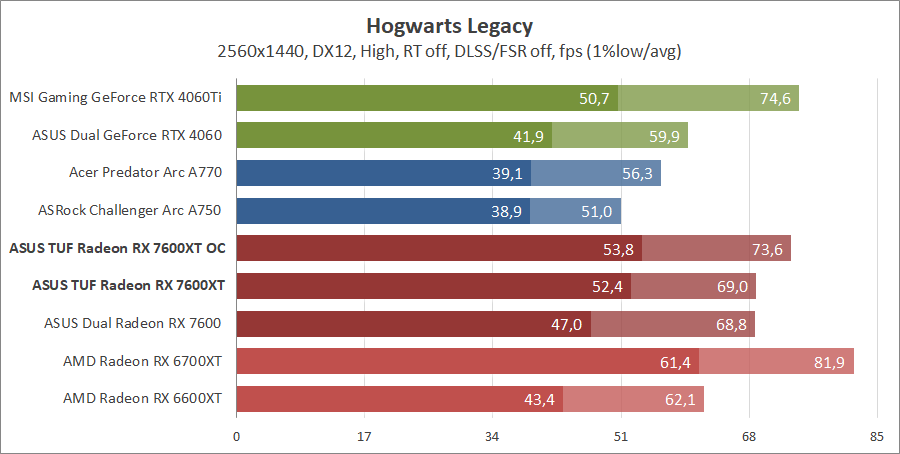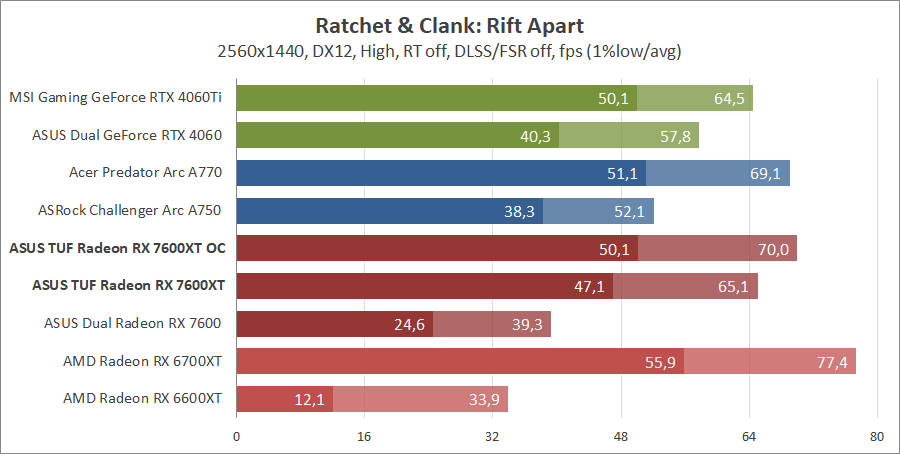 Тестирование в игровых бенчмарках происходило при разрешениях 2560x1440 и 1920x1080 с пресетами качества графики High или Ultra. Также были добавлены режимы с активированными, где это возможно, параметрами трассировки лучей. Дополнительно проводилось тестирование с технологиями DLSS или FSR в тяжелых для видеокарт играх, для карты Arc A750 использовалась технология Intel Xess. В игре Hogwarts Legacy происходила пробежка в течение минуты через городок Hogsmeade в сторону Old Fool, в Star Wars Jedi: Survivor, Ratchet & Clank: Rift Apart, Remnant II и Resident Evil 4 происходила прогулка в течение минуты в начале стартового уровня, в The Last of Us — на уровне после пролога.