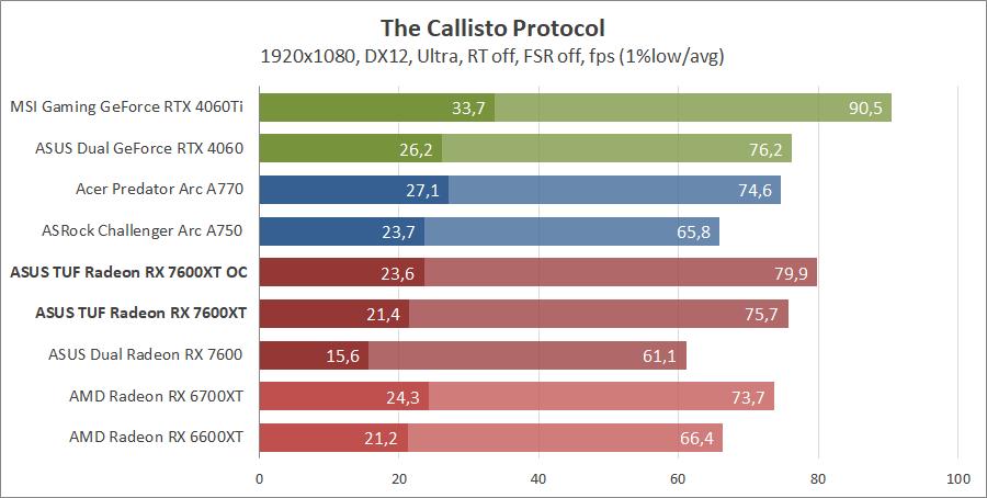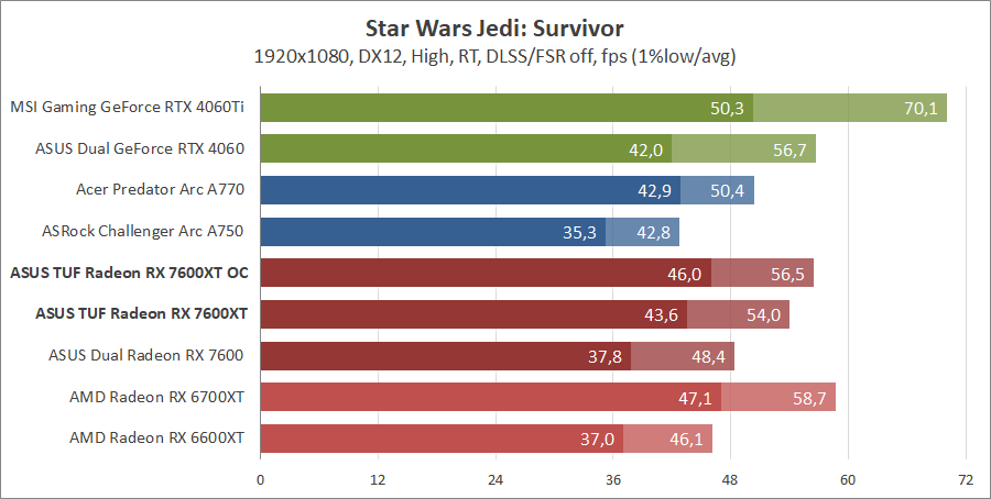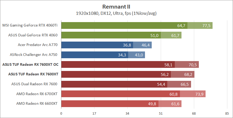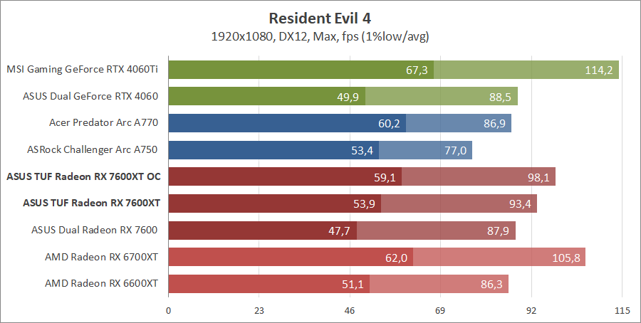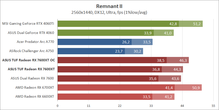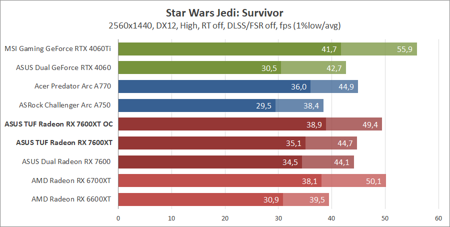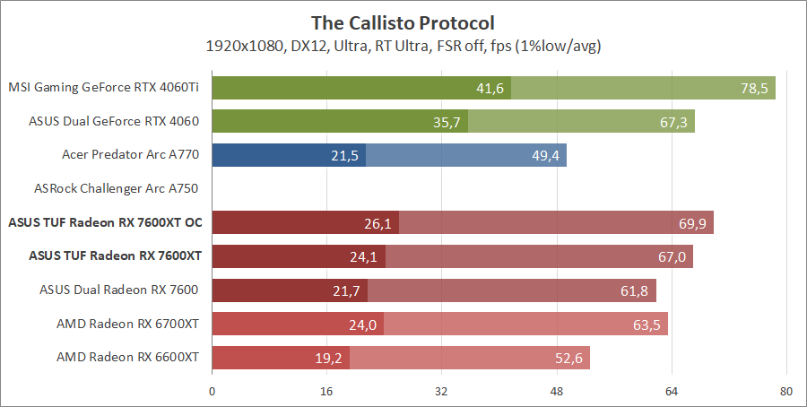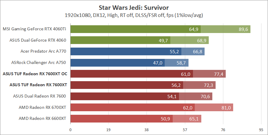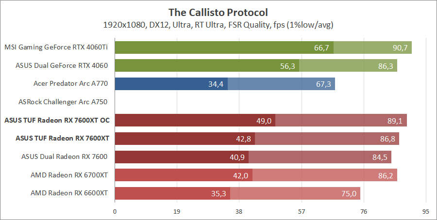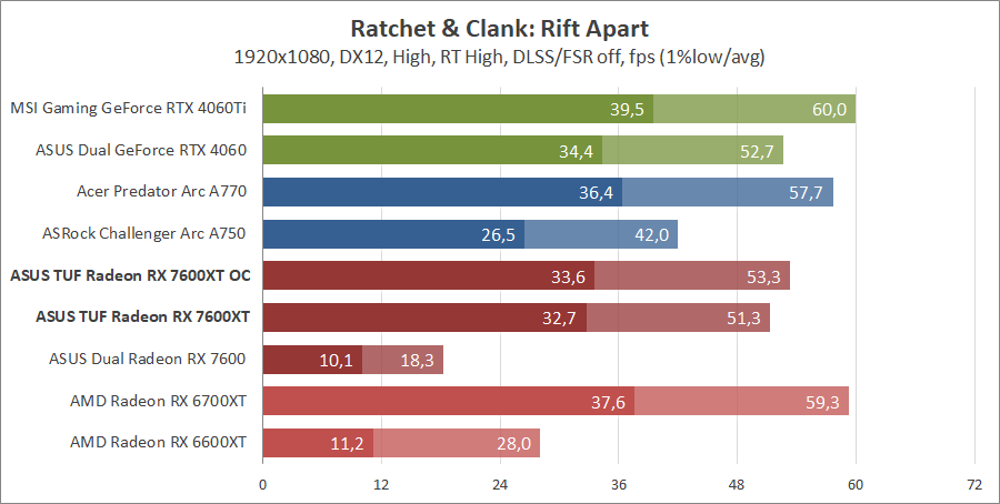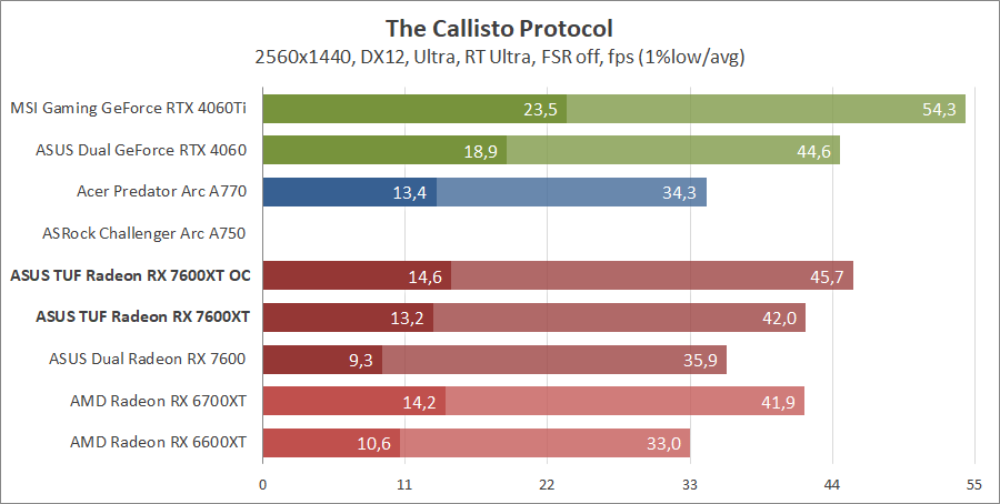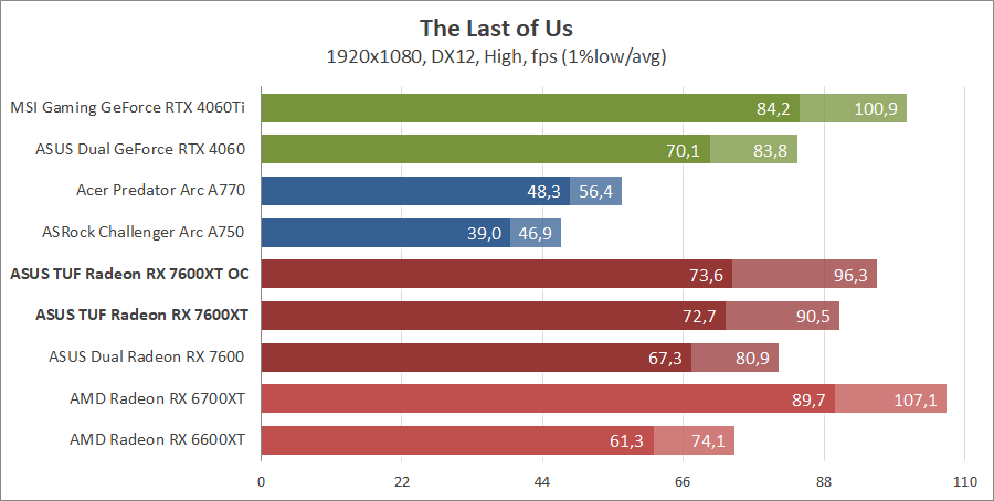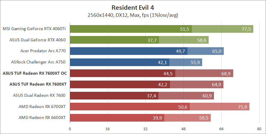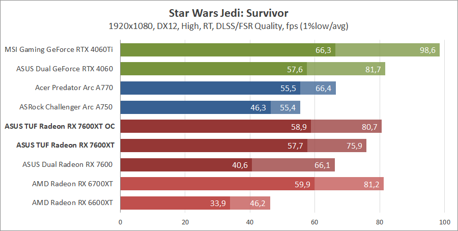 Тестирование в игровых бенчмарках происходило при разрешениях 2560x1440 и 1920x1080 с пресетами качества графики High или Ultra. Также были добавлены режимы с активированными, где это возможно, параметрами трассировки лучей. Дополнительно проводилось тестирование с технологиями DLSS или FSR в тяжелых для видеокарт играх, для карты Arc A750 использовалась технология Intel Xess. В игре Hogwarts Legacy происходила пробежка в течение минуты через городок Hogsmeade в сторону Old Fool, в Star Wars Jedi: Survivor, Ratchet & Clank: Rift Apart, Remnant II и Resident Evil 4 происходила прогулка в течение минуты в начале стартового уровня, в The Last of Us — на уровне после пролога.