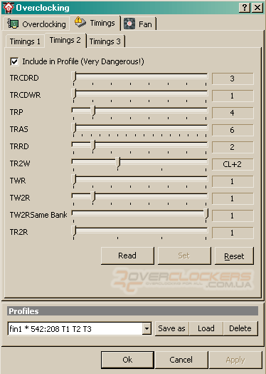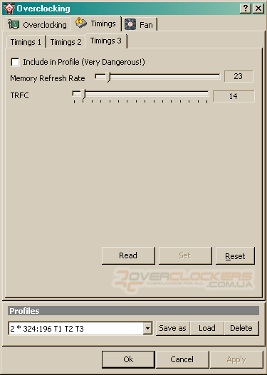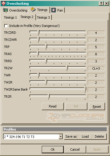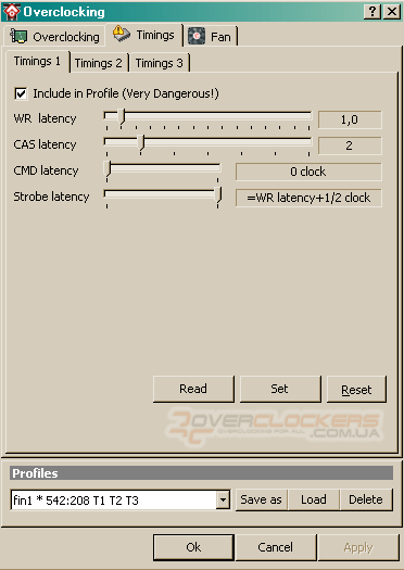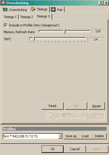 У видеопамяти (да и оперативной памяти вообще) есть тайминги. Для увеличения разгона имеет смысл попытаться их повысить, а для увеличения производительности при данной конкретной частоте - понизить. Повышение таймингов ожидаемого результата не дало, а с понижением дело куда интереснее. Смотрите сами.