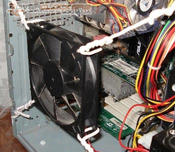 Также видеокарта обдувается 12 см вентилятором, запитанным от 5 В.