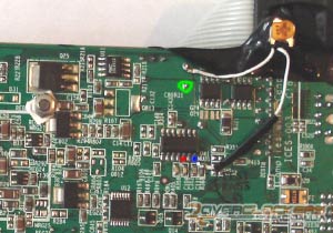 Красная и синяя точки - ноги микросхемы, к которым надо подпаивать (синяя - земля) резистор, в зеленом кружке - точка замера напряжения (+ vgpu).