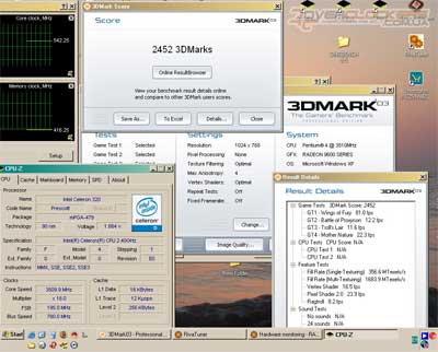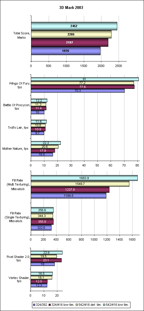 Думаю, стоит отметить, что 2452 балла - это примерный результат неразогнанного 128-битного Radeon 9550 на данной системе.