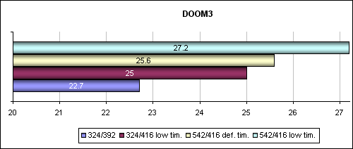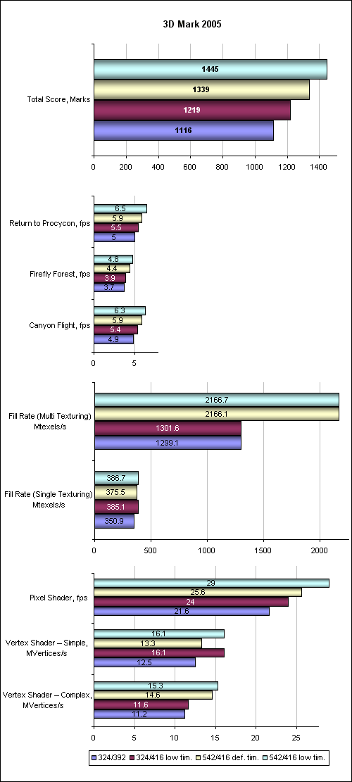 В 2005-м "марке", тесты которого просто напичканы шейдерами, наблюдается ситуация схожая с тестом Mother Nature из 2003-го. Режим "542/416 + тайминги по дефолту" обходит режим "324/416 + низкие тайминги" везде, за исключением "синглтекстурирования" и простых вершинных шейдеров, а в пиксельных на этот раз выигрывает. Действительно, шейдеры бывают разные! По мнению более новой версии марка скорость "мультитекстурирования" зависит только от чипа.