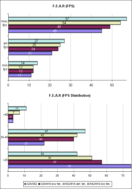 По общему результату режим "542/416 + тайминги по дефолту" обошел режим "324/416 + низкие тайминги". Прошу обратить внимание на то, что проиграл он именно в DX7-DX8 тестах (1-3), а в DX9 тесте - Mother Nature, разгон чипа куда предпочтительнее твикинга таймингов. Зато от памяти сильно зависит скорость "синглтекстурирования" и, как ни странно, работа с пиксельными шейдерами. Зато вершинные шейдеры любят большую частоту чипа. Режим "542/416 + низкие тайминги", естественно, вне конкуренции.