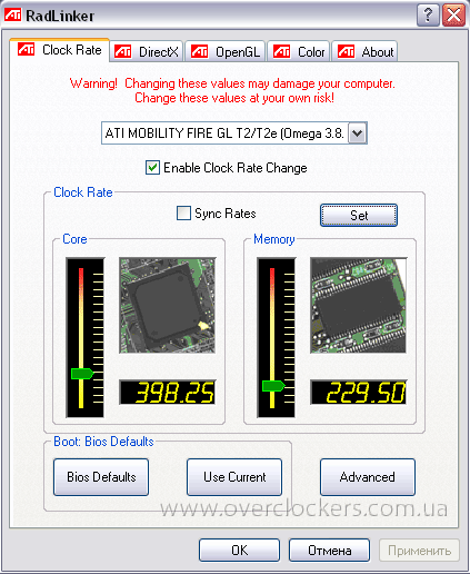 Если вы собираетесь разгонять такую видеокарту, то такой вариант вам не подойдет, потому, как драйвера блокированы для разгона. В этом случае придется скачать пропатченные драйвера Forsage или Omega. В данном случае использовался пакет Omega, в состав которого также входит утилита для разгона ATI Tray Tools. Но разогнать видеокарту данная программа, увы, не смогла. RivaTuner v2.0 RC 16 также ничем не помогла, и только небольшая программка RadLinker 2.025 позволила разогнать данную видеокарту.