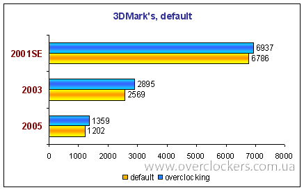Драйвер видеоадаптера настраивался на максимальное качество, AA и AF отключены, остальные настройки системы в целом по умолчанию. Для тестов использовались: 3DMark2001SE, 3DMark2003, 3DMark2005. Все настройки тестовых приложений по умолчанию.