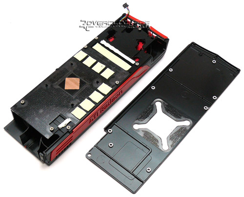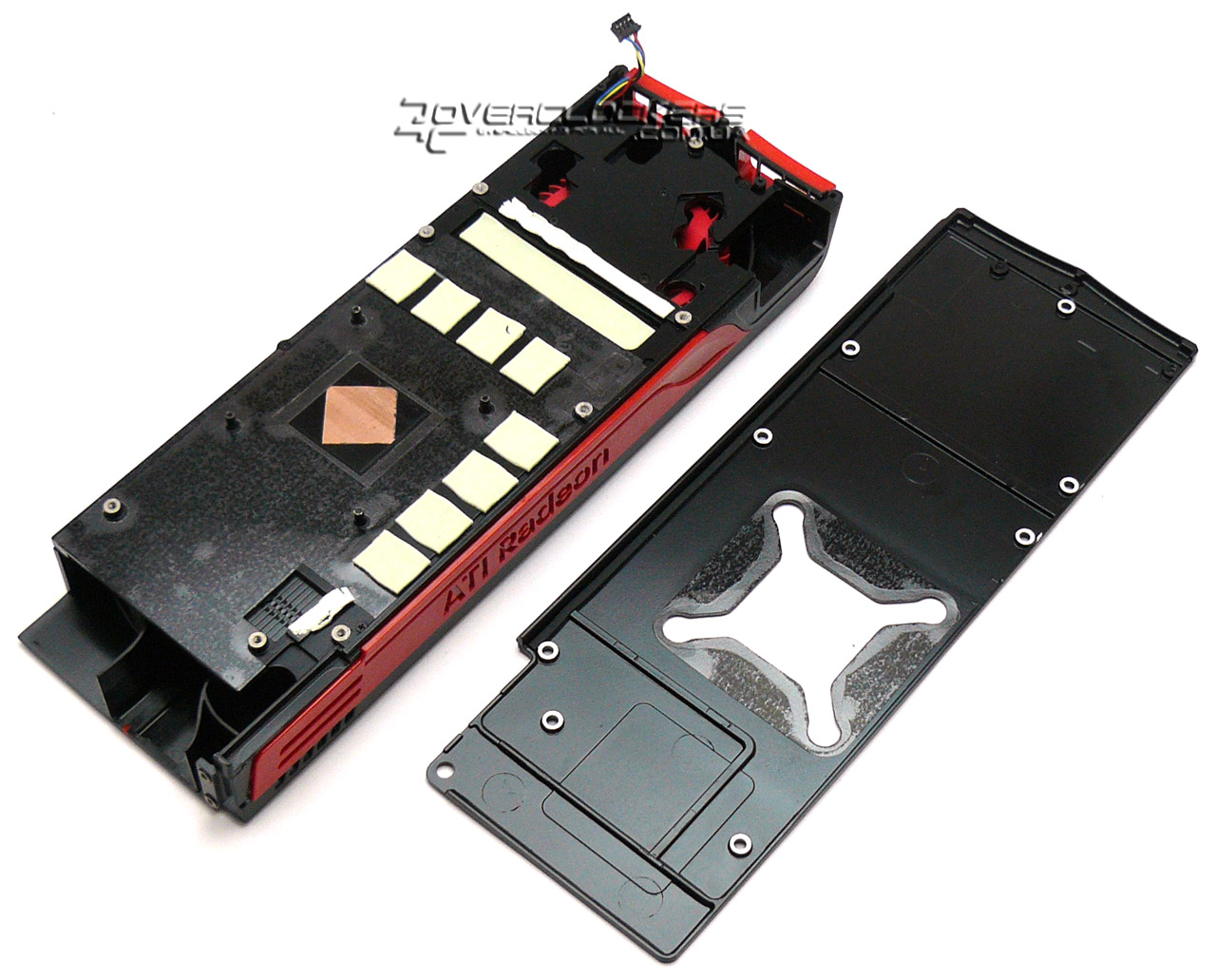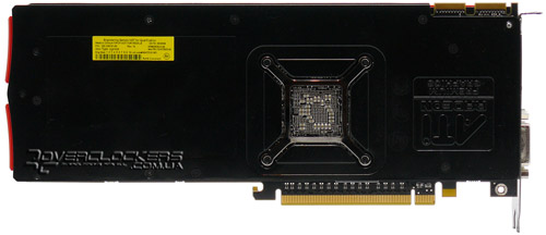 С обратной стороны видеокарты Radeon HD 5870 оснащены алюминиевой крышкой, которая несет чисто декоративную функцию и не отвечает за охлаждение каких-либо элементов. Для лучшего прижима радиатора к графическому процессору используется знакомая по старым решениям компании (а ранее и ATI) крестообразная прижимная пластина.