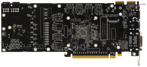 Длина печатной платы такая же, как и у Radeon HD 4870 X2, но на ней полно свободного места в районе подсистемы питания. Стабилизатор питания графического процессора реализован по 4-канальной схеме, памяти — по 2-фазной. На обратной стороне отсутствуют какие-либо силовые элементы, поэтому декоративная крышка, возможно, все-таки используется еще и для защитной функции.