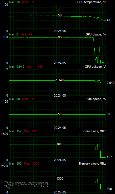 Вот только стабильности при таком режиме удалось добиться после повышения оборотов турбины до 50% от максимума, что также сказалось на температурном режиме видеокарты. Уровень шума после этого, естественно, вырос.
