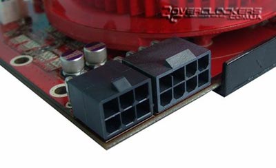 Один из разъемов не стандартный 6-пиновый, а восьмипиновый. Стоит отметить, что все видеокарты Radeon HD 2900 XT идут без переходника на данный разъем, в который без проблем можно воткнуть стандартный 6-контактный. Для нормально работы карты достаточно двух 6-pin разъемов. Но неизвестно как это отразится на разгоне, ведь карта отличается высоким энергопотреблением, и, возможно, как раз эти незадействованные линии питания не позволят реализовать весь потенциал карты.