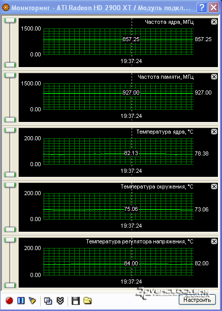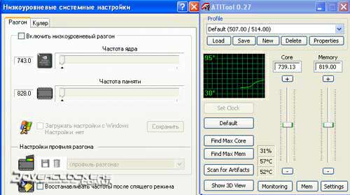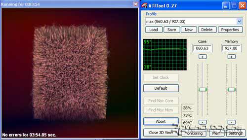 Для мониторинга и разгона видеокарты использовались RivaTuner 2.02 и ATITool 0.27 b2. С помощью второй программы осуществлялось тестирование на стабильную работу в "волосатом кубе".