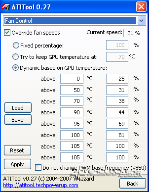 Скорость оборотов вентилятора динамически изменяется в зависимости от температуры ядра. RivaTuner и ATITool имеют возможность регулировать обороты кулера и изменять порог переключения. Стандартные значения видны на скриншоте: