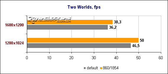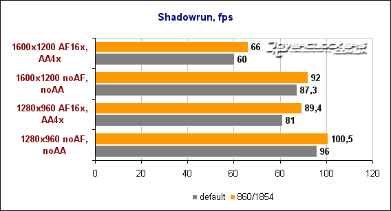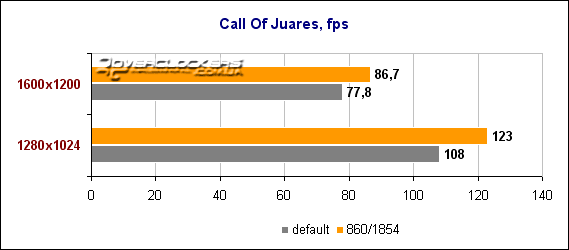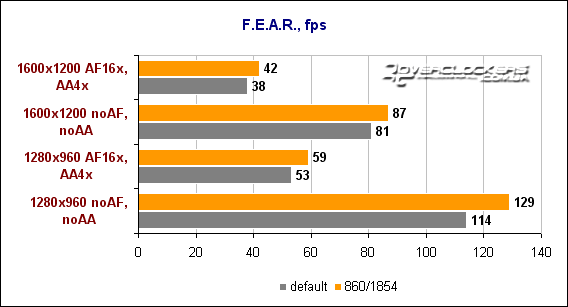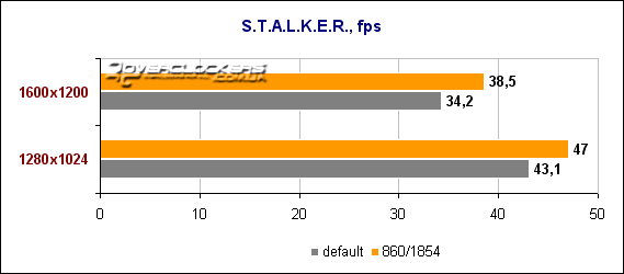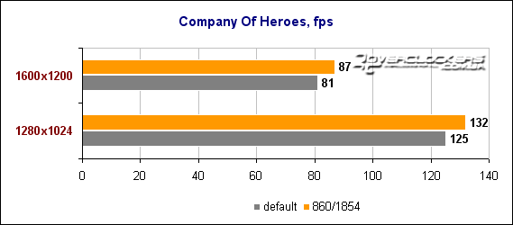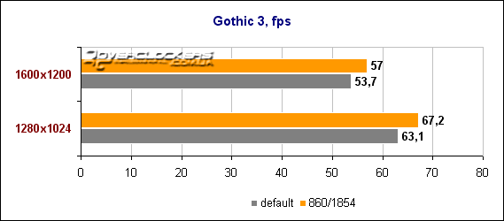 Хоть на диаграмме уже и не такие большие числа, как в предыдущих играх, но fps довольно высокий и играбельный даже в разрешении 1600х1200. Повышенные частоты позволяют выиграть еще 9-12% производительности.