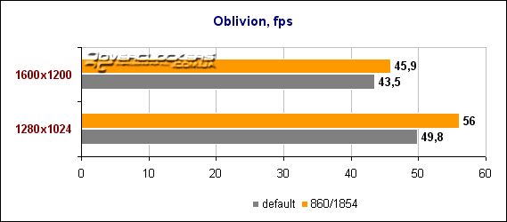 Oblivion легко сдается новичку. Средний fps стремится к 50 кадрам, что было в свое время недостижимо для лидеров прошлого поколения. С повышением разрешения падение производительности минимально - 14%, что, несомненно, радует. Разгон позволяет еще выиграть 5-12%.