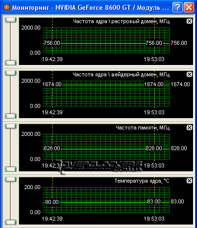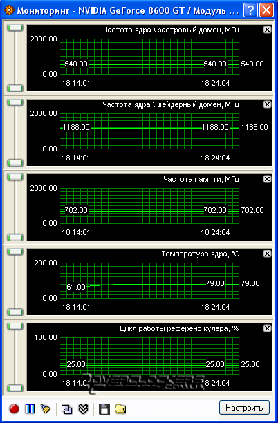 Номинальные частоты, как и положено GeForce 8600GT, равны 540/1188/702 (1404) МГц (ядро/шейдерный домен/память).