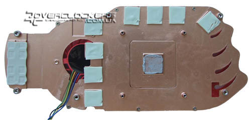 Медный радиатор закрывает почти всю плату. Он охлаждает еще и чипы памяти, и силовые элементы схемы питания, термоинтерфейсом для них служат специальные термопрокладки. На лицевой стороне радиатор покрыт маленькими тонкими ребрами, которые продуваются вентилятором. В области схемы питания радиатор имеет шипы, так же для увеличения эффективной рабочей поверхности. Свободная нижняя часть пластины радиатора покрыта диэлектрической пленкой, которая предотвращает замыкание в случае случайного контакта с элементами платы.