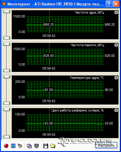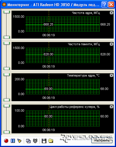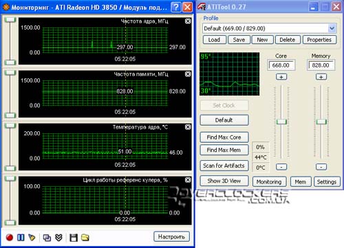 С новой видеокартой работают RivaTuner 2.06 и ATITool 0.27b3, без проблем сразу определяя ее. Частоты данного экземпляра 668/828(1656) МГц. При работе в 2D чип работает на 297 МГц, под нагрузкой его частота сразу поднимается до 668 МГц. Интересно, что ATITool постоянно показывает максимальную частоту чипа, в то время как RivaTuner фиксирует разные значения.