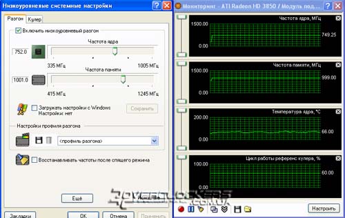 Конечно же, была произведена попытка разгона. Поскольку с ATITool возникли некоторые проблемы в этом плане, разгон осуществлялся средствами RivaTuner. Чип поднимался до частоты 800 МГц и выше, но работа карты была нестабильна. Пришлось ограничиться значением в 750 МГц. Память начинала нестабильно работать и выдавать артефакты на частоте около 2050 МГц. Работа на 2000 МГц была без сбоев.