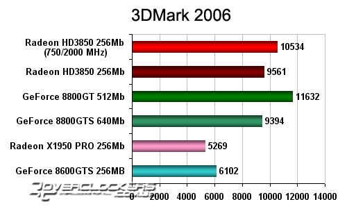 GeForce 8800GT уверенно занимает первое место. Radeon уступает ему 21%, но почти на 2 % обгоняет GeForce 8800GTS. Отрыв от более слабых видеокарт просто огромен, 50-80%. Разгон помогает поднять результат еще на 10%, но достичь лидера это не позволяет, зато преимущество над GeForce 8800GTS уже впечатляет.