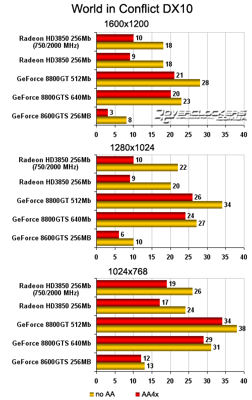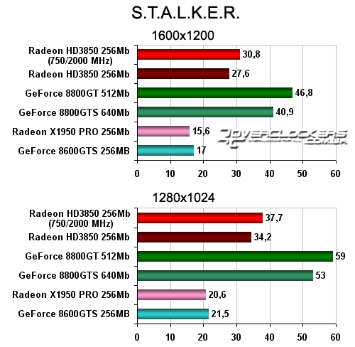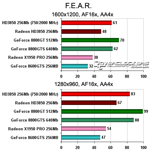 Представители Nvidia в данной игре чувствуют себя отлично. Старшие модели уверенно лидируют, отставание Radeon HD 3850 от GeForce 8800GT 70%. Разгон позволяет выиграть лишь дополнительные 10%. А вот аутсайдером в этой игре становится Radeon X1950 PRO, уступая 5-9% младшей карте Nvidia и 66-97% сопернику на RV670.
