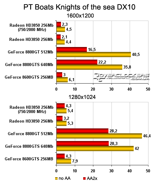 Первые несколько игр под DirectX 10 мы протестируем в режимах со сглаживанием и без. Демоверсия PT Boats будет первым тестом. Radeon X1950 PRO здесь уже не участвует, ведь она не поддерживает DirectX 10.