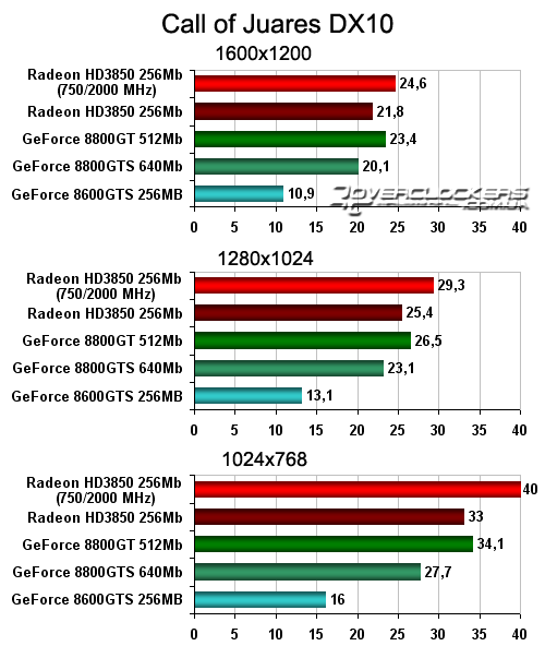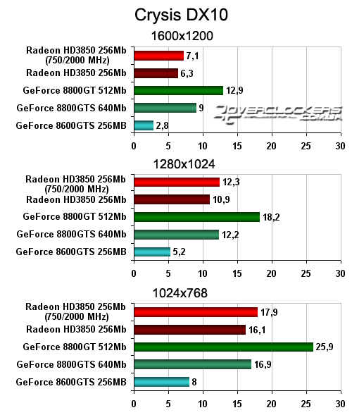 GeForce 8800GT уверенно держится на пьедестале. Radeon HD 3850 идет практически наравне с GeForce 8800GTS, но с повышением разрешения отставание становится ощутимым. Разгон увеличивает производительность на 12%. Превосходство над GeForce 8600GTS 256MB огромно, и снова почти в два раза.