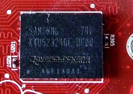На плате установлена GDDR4 память производства Samsung со временем доступа 0,8 нс, т.е. рассчитанная на эффективные 2500 МГц.