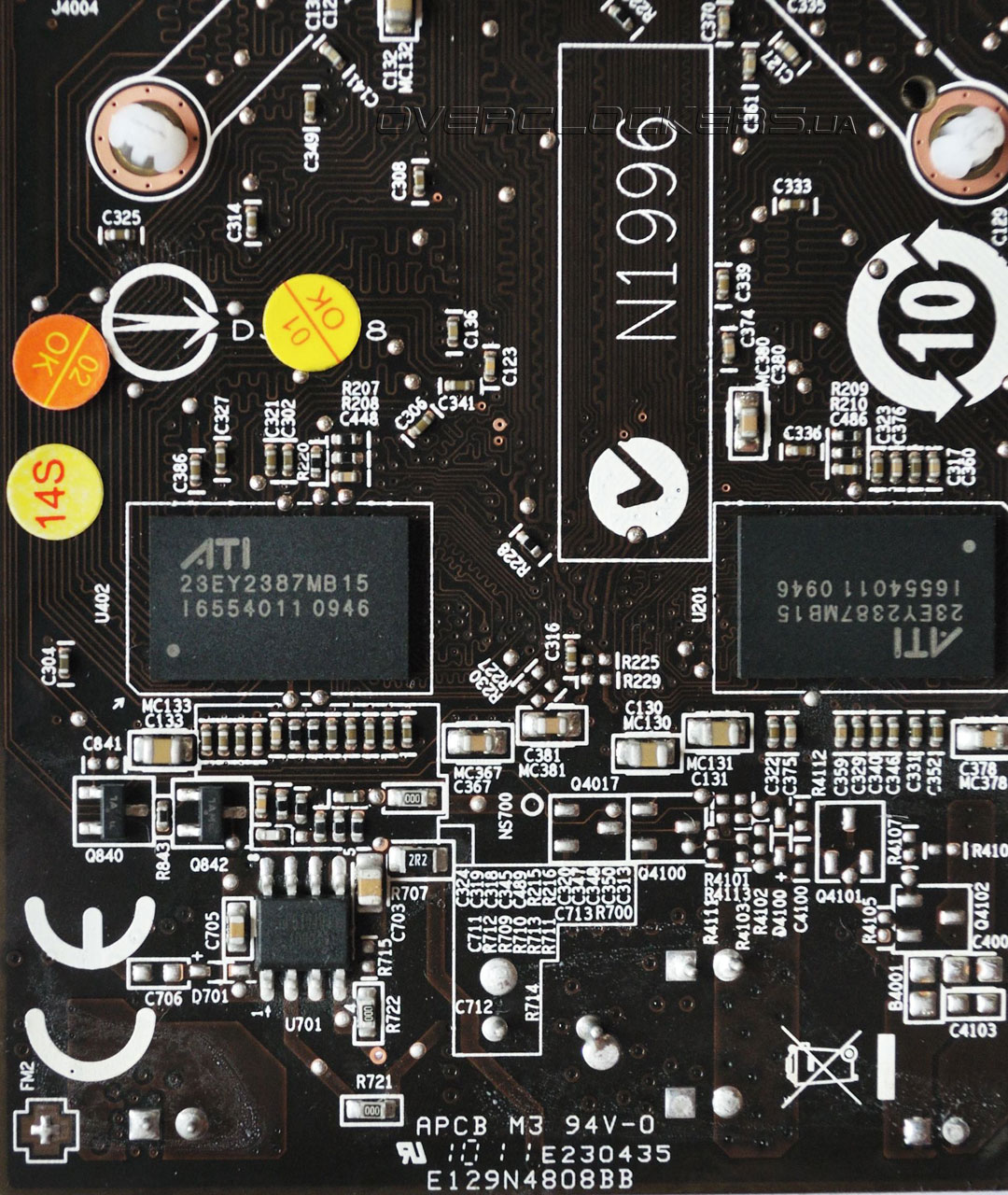 Видеокарта несет на борту 512МБ DDR3, набранной четырьмя микросхемами: по две с каждой стороны PCB: