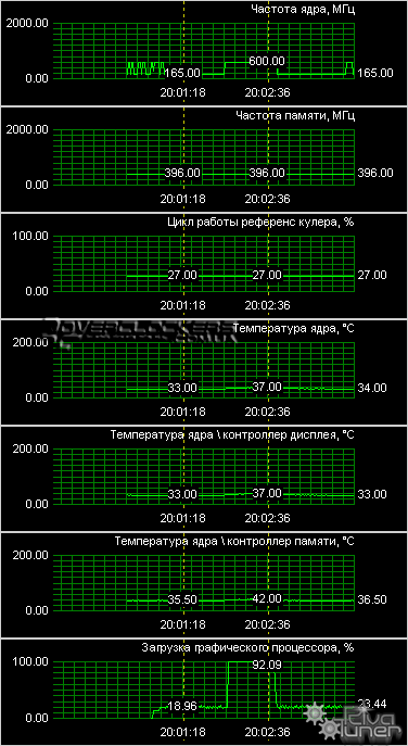 Стоит отметить, что у рассматриваемого экземпляра переключение между частотами происходило довольно часто. Постоянно фиксировалась нагрузка на GPU около 20%, даже если рабочий стол оставался нетронутым, а при любом действии нагрузка оказывалась чуть выше порога в 20% и в результате повышались частоты – достаточно было лишь перетянуть окно или активно подергать курсором. Возможно это некая недоработка BIOS карты, ведь никакой нагрузки нет, но она фиксируется, и в итоге неэффективно работает энергосберегающая технология.