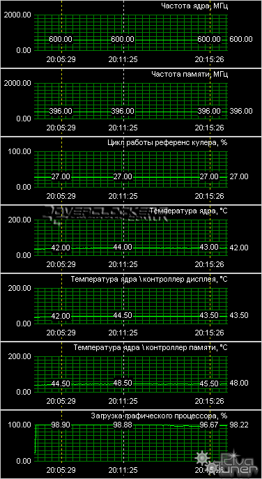 Разгон этой видеокарты оказался под стать всем ее остальным «выдающимся» показателям. Растровый домен удалось разогнать лишь до 576 МГц, стрим-процессоры до 1458 МГц, только память выделилась пристойным результатом, стабильно заработав на 1172 МГц.