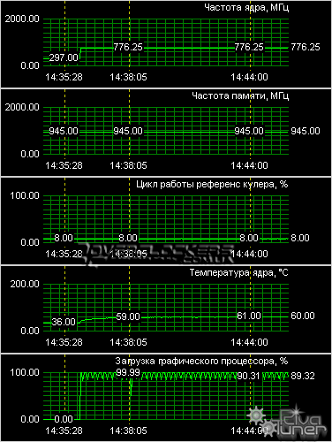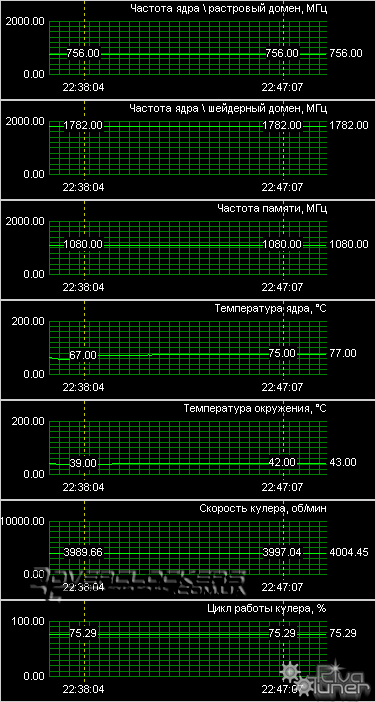 С помощью RivaTuner видеоадаптер был разогнан до частот 756/1782/2160 МГц, что на 29/22/20 % выше номинала. Для стабильной работы обороты вентилятора были увеличены до 4000 RPM, что позволило удерживать температуру в разгоне в пределах 77 °C, но шум был уже очень высоким.