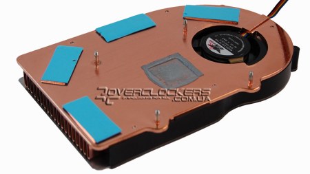 Система охлаждения представлена все тем же характерным двухслотовым кулером, только в данном случае его радиатор больше и имеет квадратную форму.