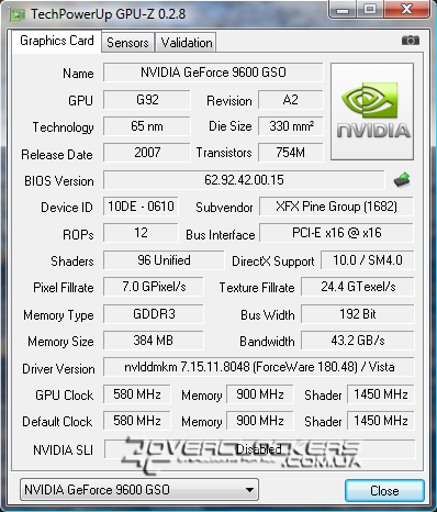 Частично стерев терможвачку с чипа, мы обнаружили маркировку G92-150-A2, так что используемый GPU такой же, как и на остальных GeForce 9600 GSO (GeForce 8800 GS). Такой же стандартный GPU для этого семейства с 96 потоковыми процессорами показывает в данных и программа GPU-Z.