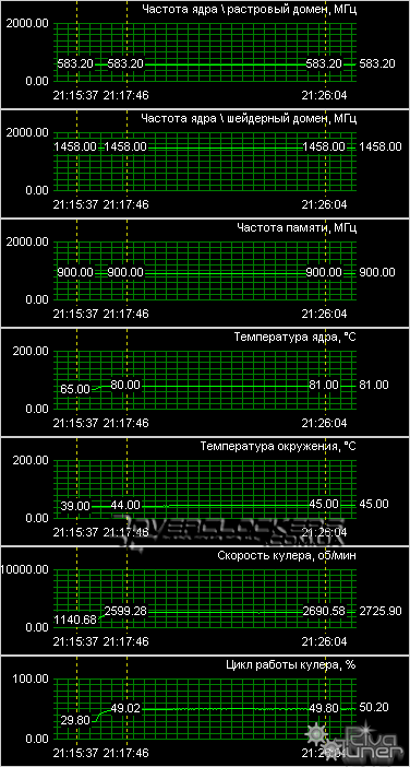 Ядро работает на частоте 583 МГц, потоковые процессоры на 1458 МГц, память на 1800 МГц. Под нагрузкой ядро прогревается до 81 °C, при этом кулер раскручивается до 50% своего потенциала и создаваемый им гул уже отчетливо слышен.