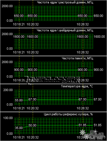 Рабочие частоты этой модели соответствуют стандартным спецификациям: ядро работает на 650 МГц, шейдерные блоки на 1600 МГц, память на 1800 МГц. Под нагрузкой «волосатым кубом» ATITool ядро прогрелось до 67 °C, обороты кулера не превысили 52%.