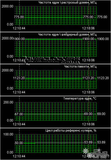 Номинальные рабочие частоты этой видеокарты: ядро – 621 МГц, шейдерный домен – 1350 МГц, память – 1800МГц. Разгон – 738/1782/2052 МГц, соответственно.