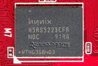 Видеопамять объемом 512 МБ набрана восемью микросхемами Hynix H5RS5223CFR со временем доступа 1,0 нс.