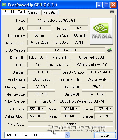 Разгон, как мы и ожидали, оказался небольшой. Ядро разогналось лишь до 617/1566 МГц, что немногим больше частот обычной версии GeForce 9800 GT. А вот разгон памяти больше порадовал — GDDR3 стабильно заработала на 2124 МГц.