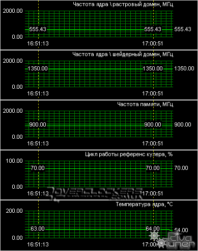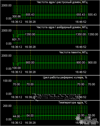 В 2D частоты ядра снижаются до 300/600 МГц, памяти — до 200 МГц. В стресс-тесте ATI Tool графический чип прогревался лишь до 56 °C, а обороты кулера не поднимались выше 30%.